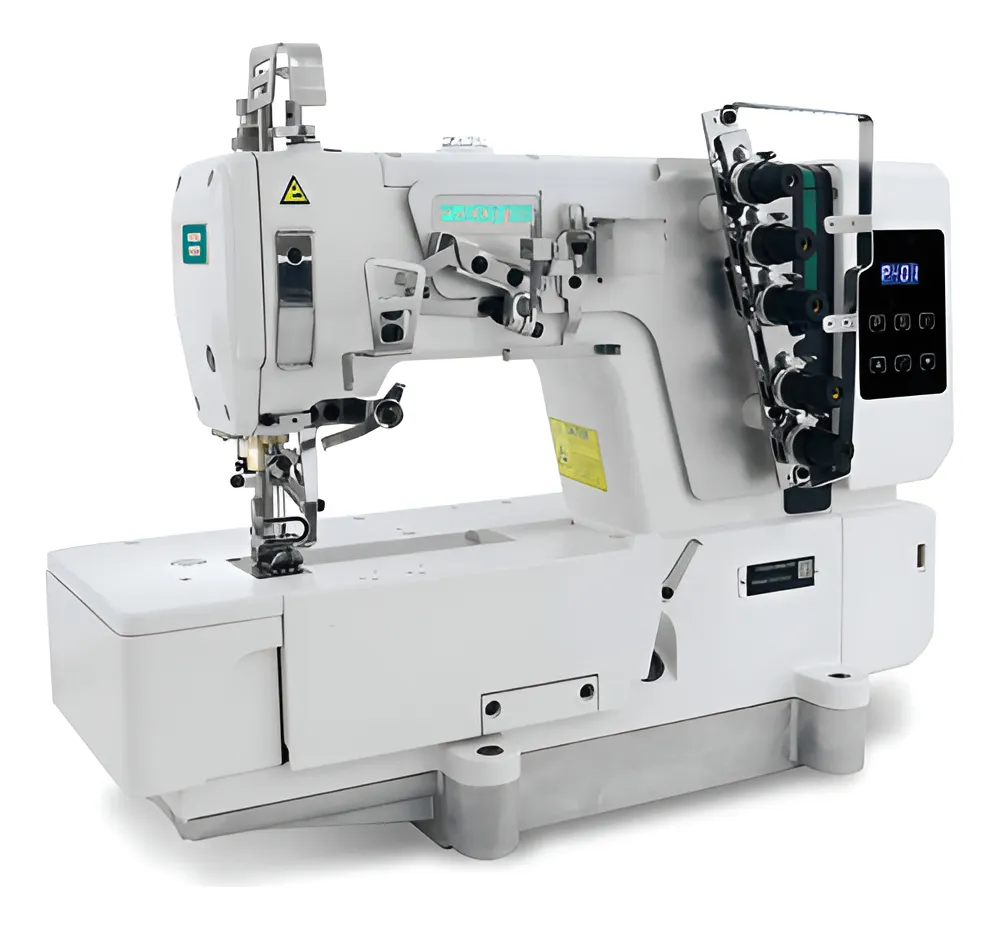 A Galoneira Zoje C5000-364/02 é uma máquina industrial plana com motor Direct Drive que economiza muita energia e faz pouco barulho enquanto você trabalha nela,ela vem com corte de linha automático e levantador de calcador para agilizar a produção de camisetas e roupas fitness além de ter três agulhas e cinco fios com bitola de 6,4 mm.